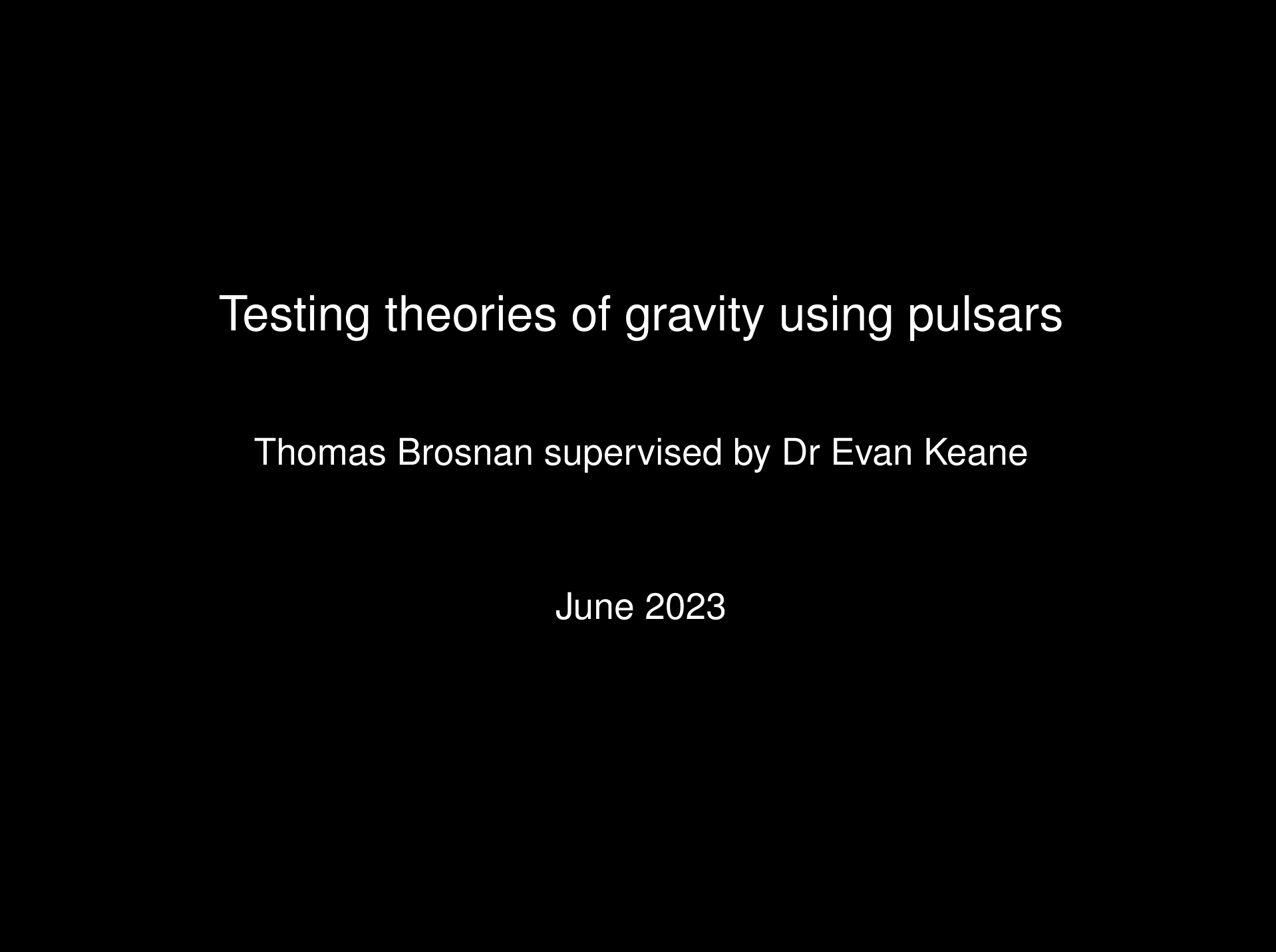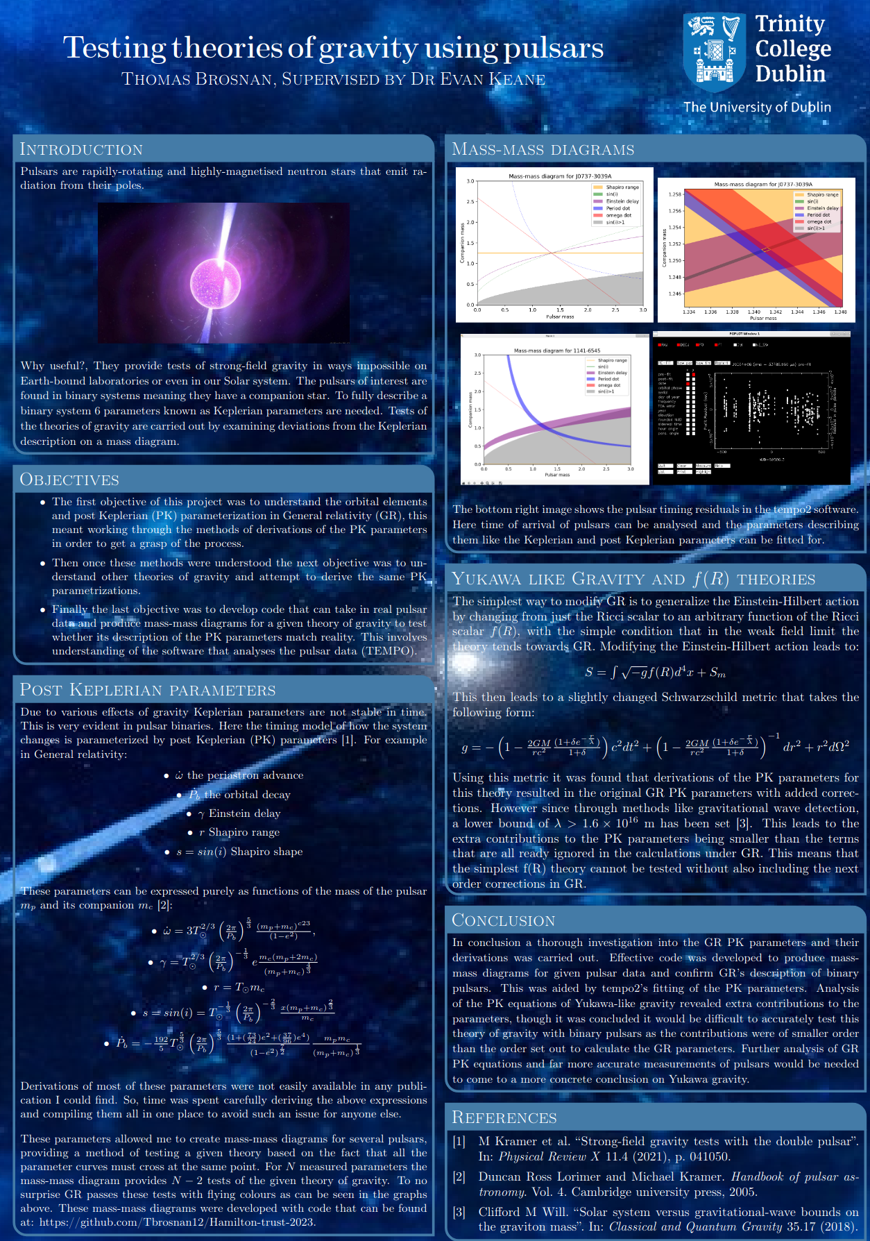 In the summer of 2023 I took part in the Hamilton Trust Internship at the School of Mathematics TCD. Working with Professor Evan Keane, I used pulsars as a medium to test theories of gravity such as General Relativity (GR) and Yukawa like gravity, deriving equations in both theories that governed how the parameters of a binary system containing a pulsar changed with time due to the various effects of the given theory.